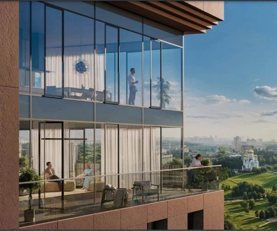 В её верхней части находятся квартиры с угловым панорамным остеклением, что придает силуэту визуальную легкость. Башня соединятся с корпусом, обращённым в сторону набережной. В нём расположены остекленные террасы на верхних этажах, а панорамные окна обрамлены колоннами.